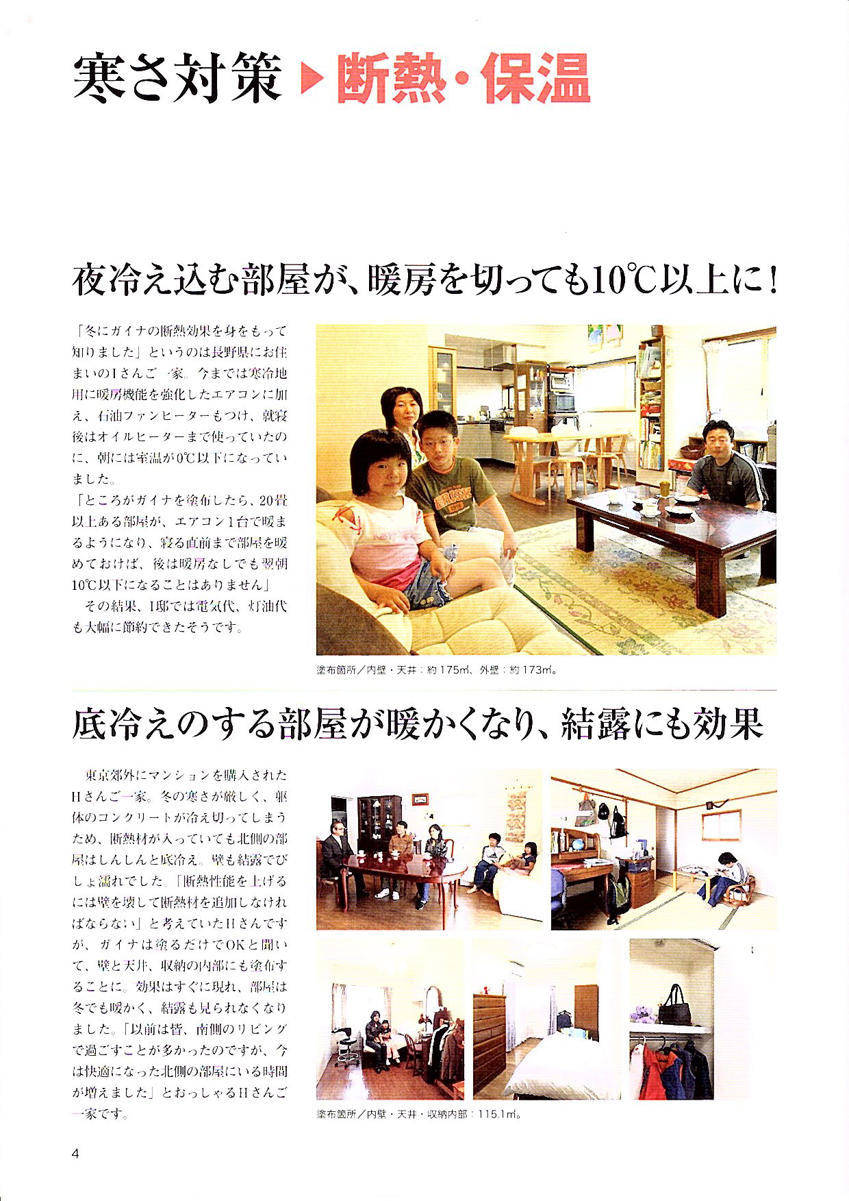 ところがガイナを塗布したら、20畳以上ある部屋が、エアコン1台で暖まるようになり、寝る直前まで部屋を暖めておけば、後は暖房なしでも翌朝10℃以下になることはありません。