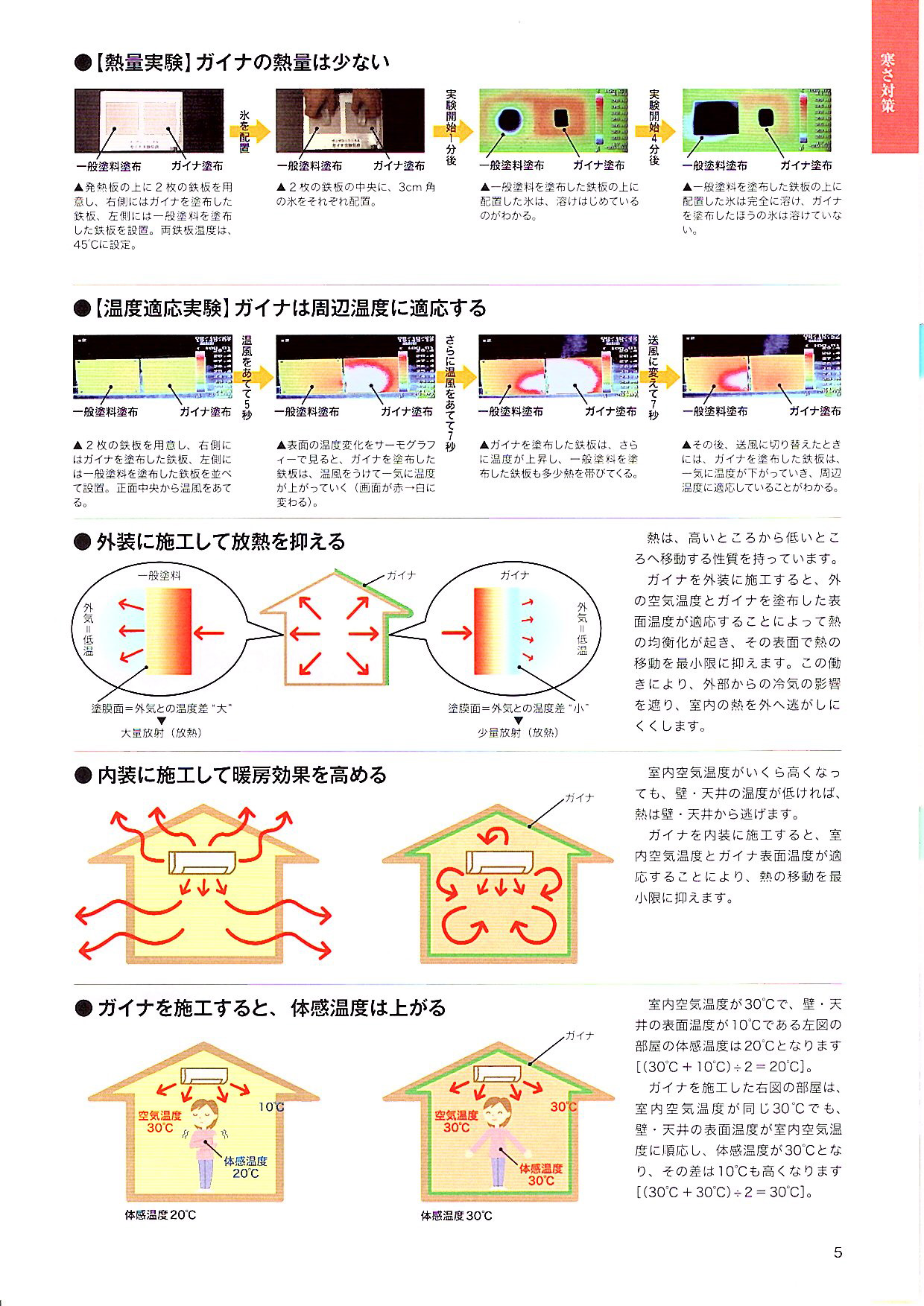 ガイナを外装に施工すると、外の空気温度とガイナを塗布した表面温度が適応することによって熱の均衡化が起き、その表面で熱の移動を最小限に抑えます。