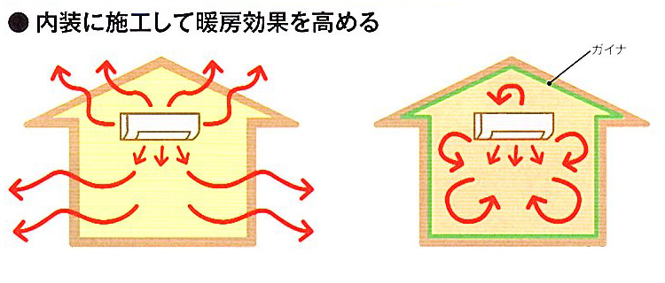 ガイナを内装に施工すると、室内空気温度とガイナ表面温度が適応することにより、熱の移動を再送減に抑えます。