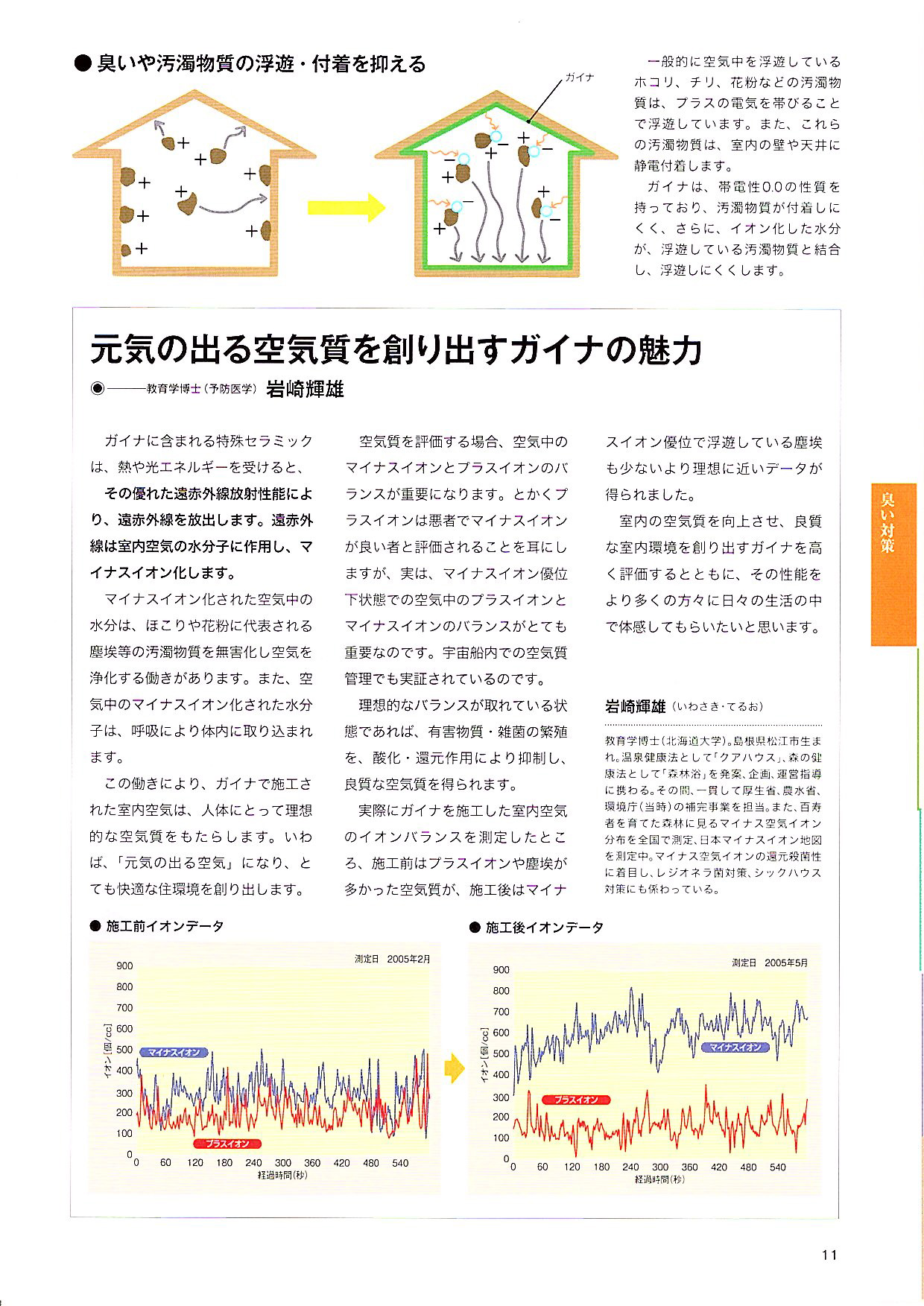 ガイナは、帯電性0.0の性質を持っており、汚濁物質が付着しにくく、さらに、イオン化した水分が、浮遊している汚濁物質と結合し、浮遊しにくくします。